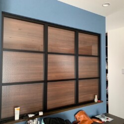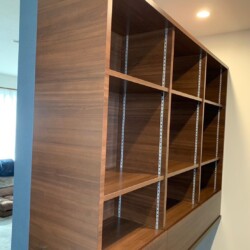 一般住宅の中にある既存のカウンター付き窓に、収納を取り付けました。窓は封鎖されてしまいますが、お客様の「収納を増やしたい」というご要望にお応えしました。封鎖した窓からは木目の化粧が見えるように取り付け、空間に温かみを加えました。また、棚は可動式で、ゆっくり閉まる引き出しも付いています。